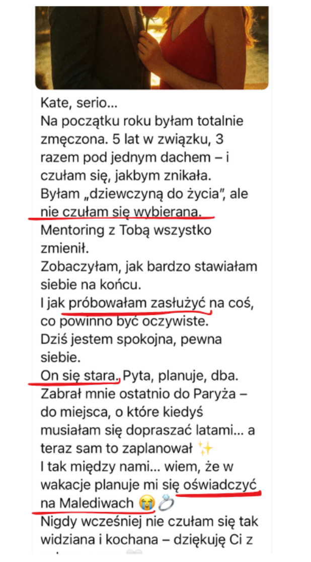 Pomagam ambitnym kobietom, które mają dość bycia „opcją”, stać się priorytetem w miłości i tworzyć relacje, w których to mężczyzna zabiega, inwestuje i wybiera je każdego dnia.
